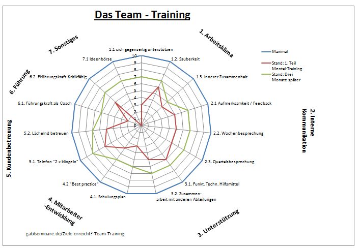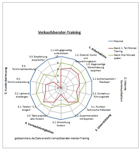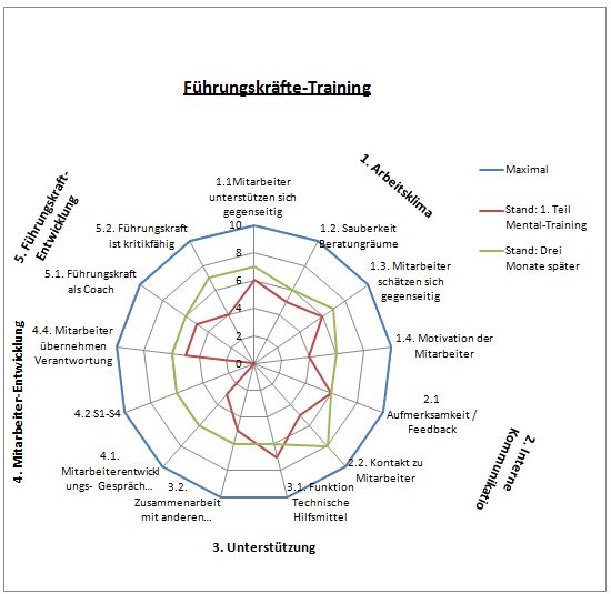 Trainingserfolge und Entwicklungen der TeilnehmerInnen können messbar gemacht werden. Dazu werden zu Beginn des Mental-Trainings die zu betrachtenden Aspekte durch die TeilnehmerInnen, Führungskraft und dem Trainer definiert, bewertet und in einer Grafik dargestellt. Nach drei Monaten werden dieselben Aspekte wiederum bewertet und in derselben Grafik eingefügt. Hier können die TeilnehmerInnen, wie auch die Führungskraft derselben und die darüberstehende Ebene die Entwicklung ersehen. Es wird zu einem Führungsinstrument einer "anderen Art" das alle Beteiligten sehr schätzen.